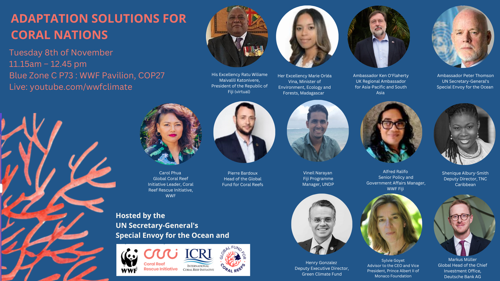 During CoP27 in Sharm El-Sheikh the Coral Reef Rescue Initiative (CRRI) together with WWF, Global Fund for Coral Reefs (GFCR) and International Coral Research Initiative (ICRI) hosted the premiere coral reef session: Adaptation Solutions for Coral Nations. The event focused on global, regional, and national organisations and entities engaged in reef-based adaptation action for ecosystems and communities. The event was co-hosted by the UN Secretary General's Special Envoy for the Ocean, Ambassador Peter Thomson, and attended by high-level representatives of governments, multilateral organisations and companies, foundations, universities and NGOs. Watch the live recording here: